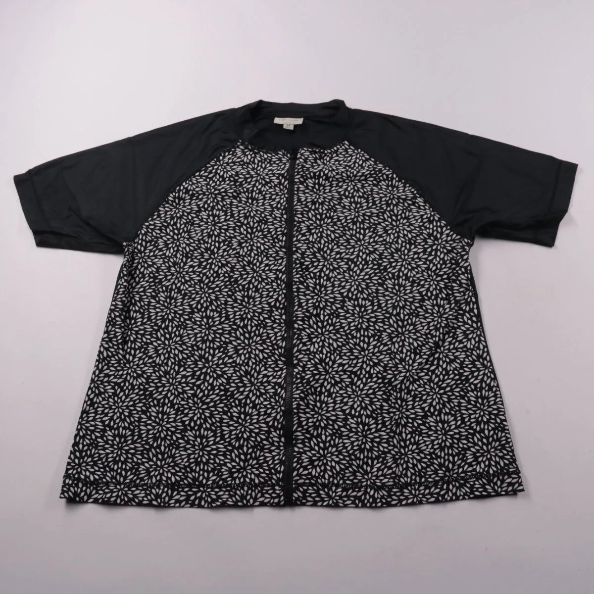 Женский купальник Autograph в виде закрытого топа с коротким рукавом и молнией спереди, чёрный с белым цветочным принтом. Подойдёт для пляжа и бассейна, а также для активного отдыха на воде. Эластичная ткань из нейлона хорошо тянется и быстро сохнет.