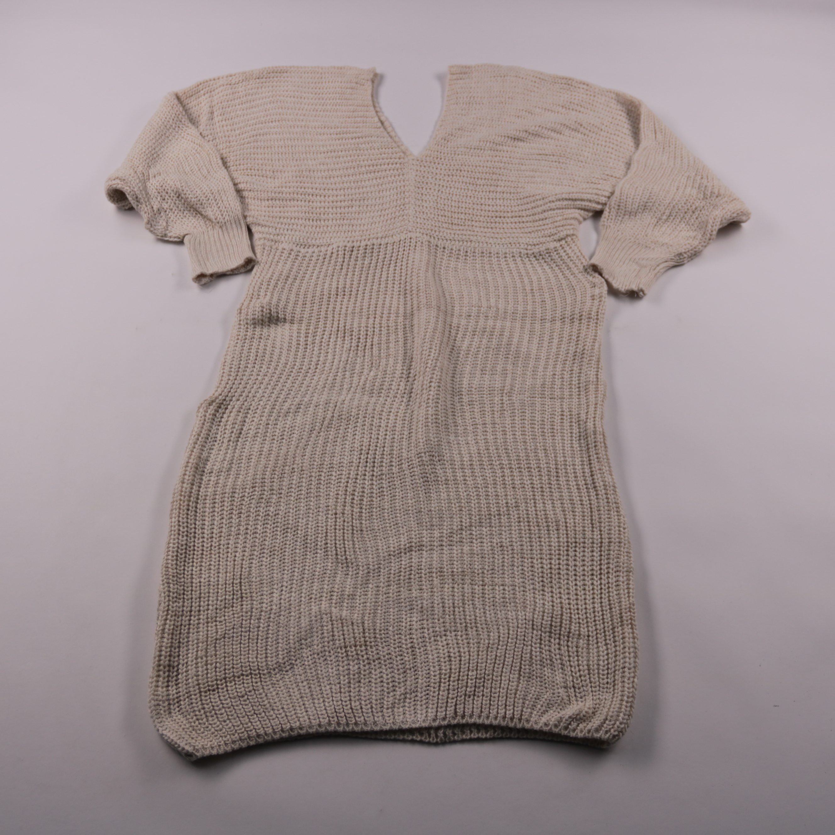 Повседневное вязаное платье Sensi Wear в бежевом цвете с V-образным вырезом и рукавом 3/4. Подойдёт для прогулок и офиса в прохладную погоду, легко сочетается с ботинками или кедами. Акриловая пряжа практична в уходе и быстро сохнет после стирки.
