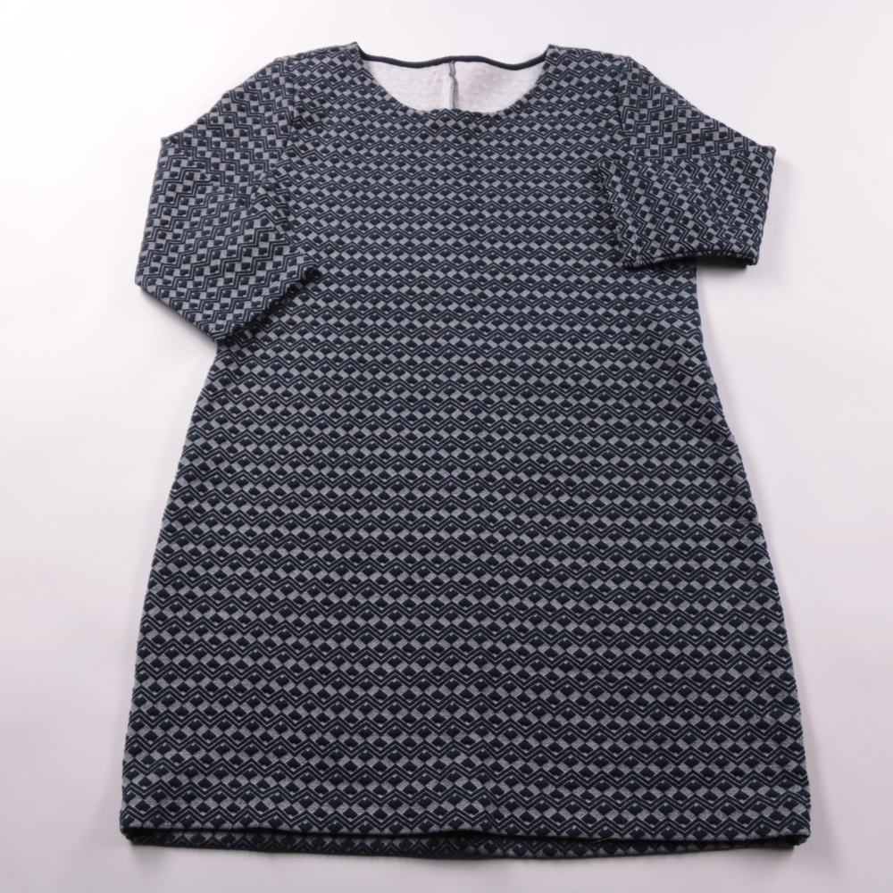 Повседневное женское платье прямого кроя с рукавом 3/4 и геометрическим узором. Подойдёт для офиса и на каждый день, легко сочетается с жакетом или кардиганом. Практичный трикотаж почти не мнётся и комфортно сидит.