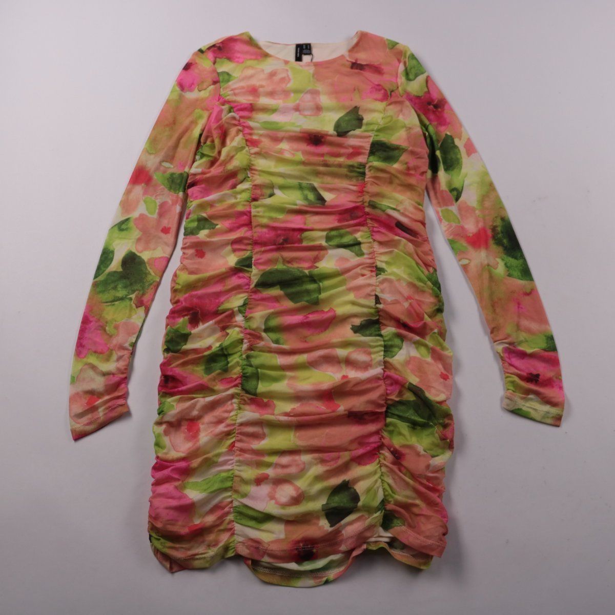 Платье Vero Moda из эластичного трикотажа с цветочным принтом и драпировкой по бокам, длина мини, длинный рукав. Подойдёт для прогулок и встреч, хорошо смотрится с кедами или ботильонами. Ткань тянется и комфортно садится по фигуре.