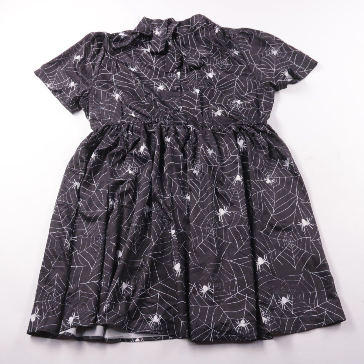 Повседневное платье SHEIN Curve с воротником, короткими рукавами и принтом «паутина/пауки» в чёрно-белой гамме. Подойдёт для прогулок и тематических образов, за счёт сборки на талии сидит свободно. Практично тем, что лёгкое и простое в уходе (машинная стирка).