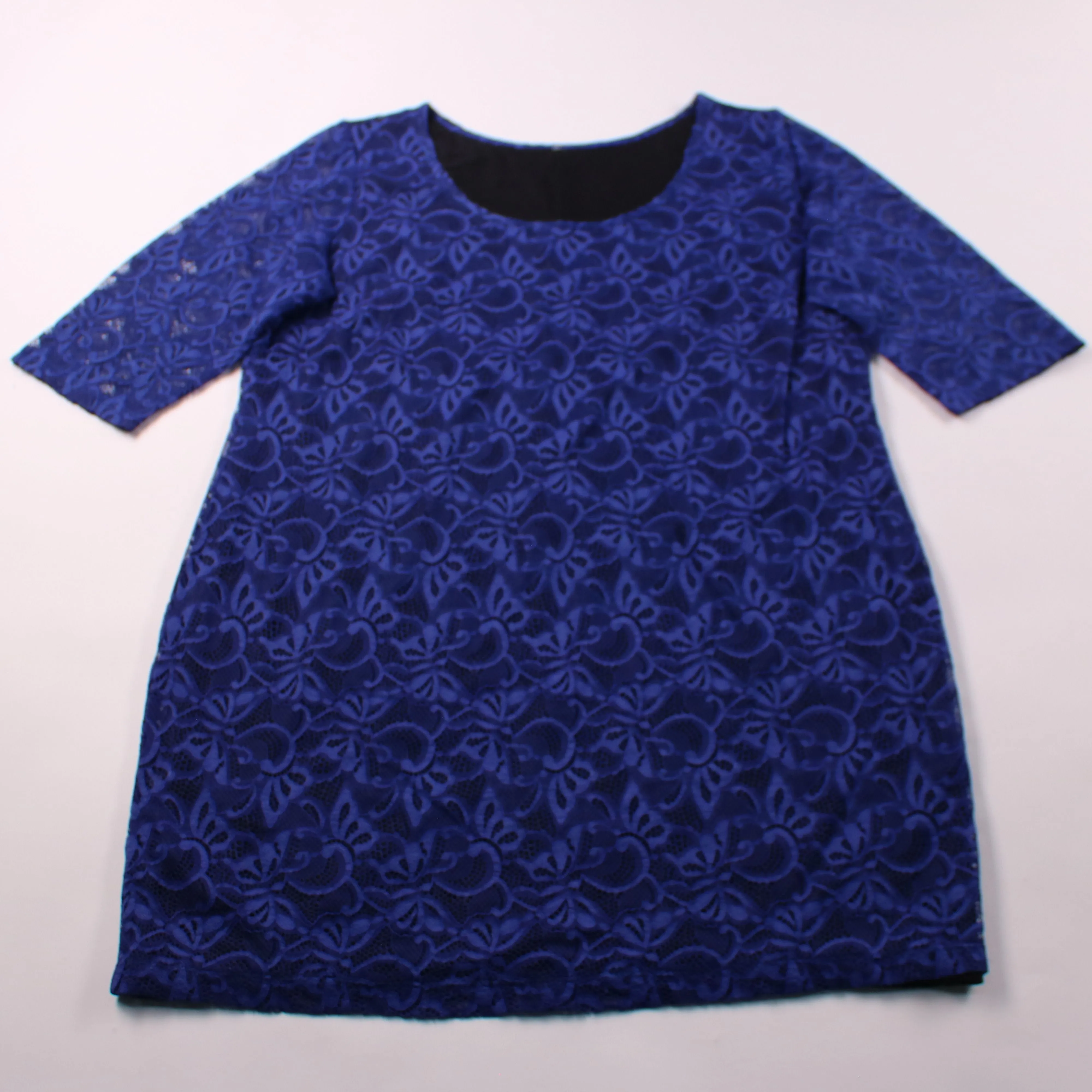 Синее кружевное платье с коротким рукавом и округлым вырезом, на подкладке. Подойдёт для вечернего выхода, праздника или торжественного мероприятия. Плотная подкладка делает модель менее прозрачной и удобной в носке.
