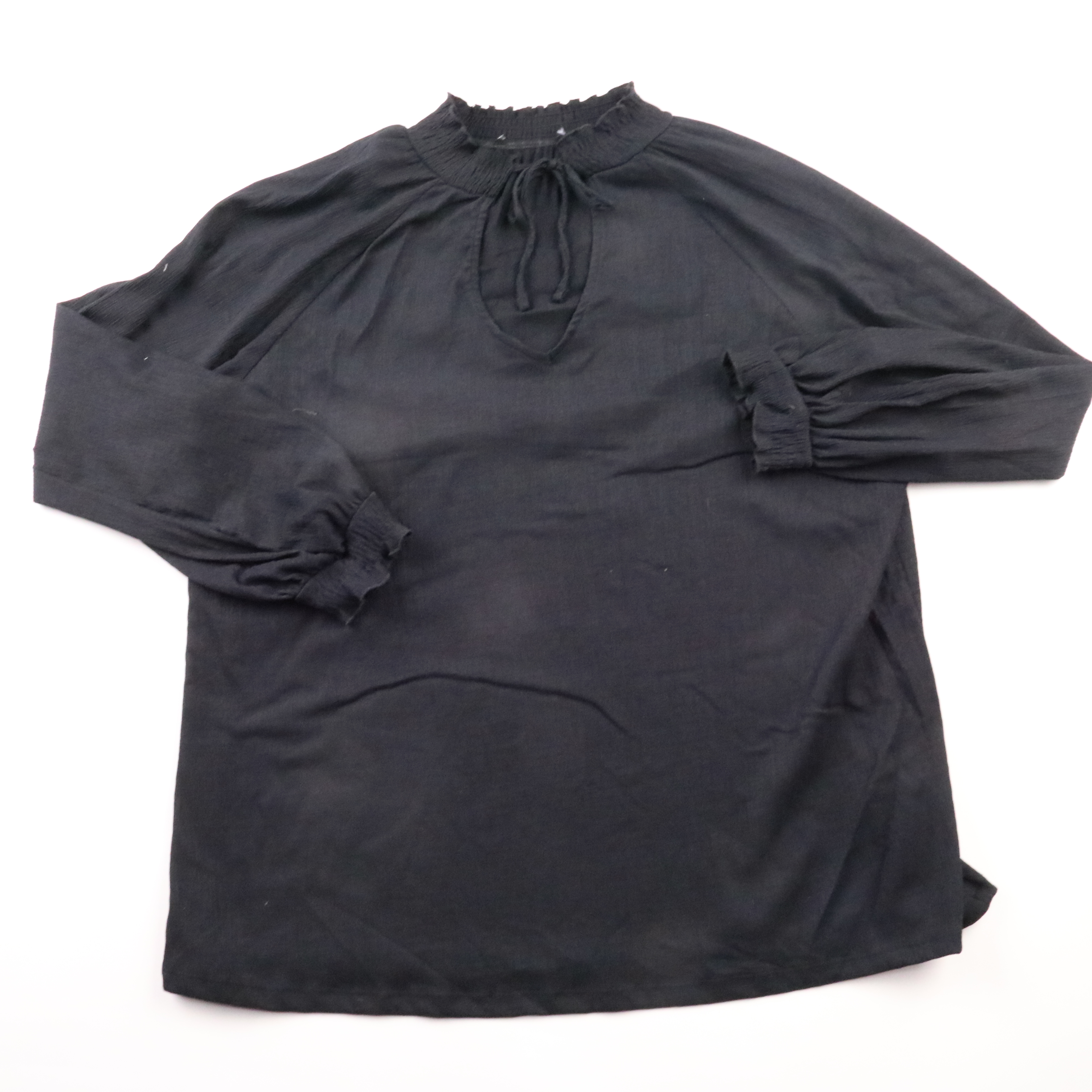 Чёрная блузка с воротником-стойкой и завязками на горловине, рукава длинные с манжетами. Подойдёт для офиса и повседневных образов, легко сочетается с брюками и юбками. Практичный материал почти не мнётся и быстро сохнет.