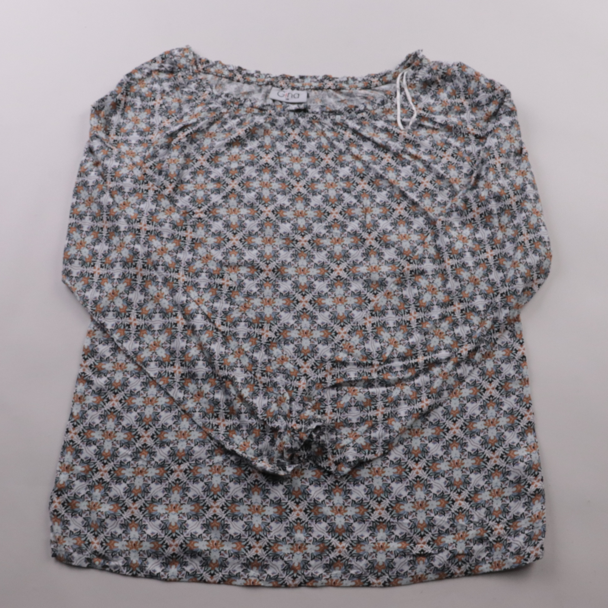 Блузка Gina из 100% вискозы с мелким принтом в серо-бело-оранжевой гамме и сборкой у горловины. Подойдёт для повседневных образов и офиса, легко сочетается с джинсами и однотонными брюками. Вискоза мягкая и хорошо дышит, комфортно носить целый день.