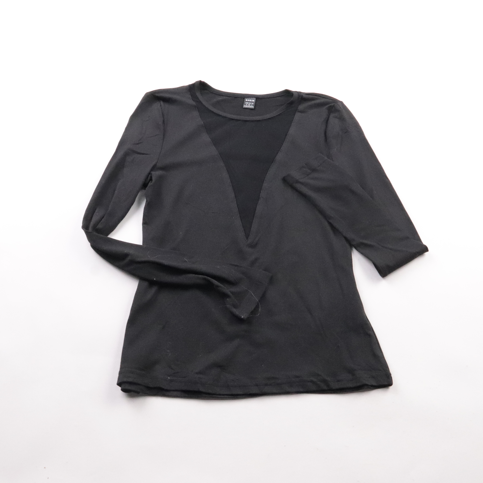Женская чёрная блузка Shein с V-образным вырезом и рукавом 3/4. Подойдёт для офиса и на выход, легко сочетается с юбкой или брюками. Практична в уходе: ткань почти не мнётся и быстро сохнет.