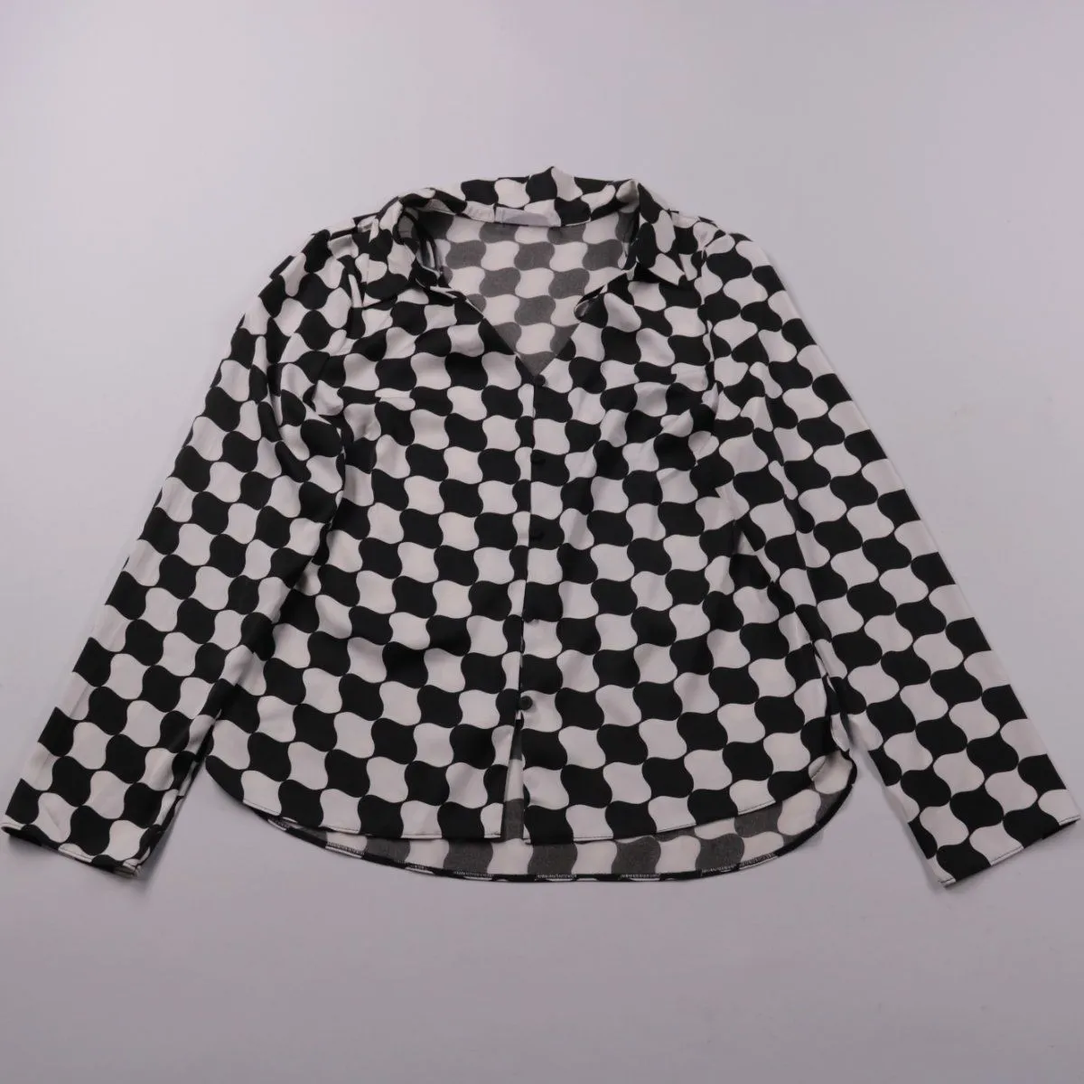 Женская блузка Primark с отложным воротником и длинным рукавом, выполнена в чёрно-белом геометрическом принте. Подойдёт для офиса и повседневных образов с джинсами или брюками. Лёгкая ткань практически не мнётся и удобна в уходе.