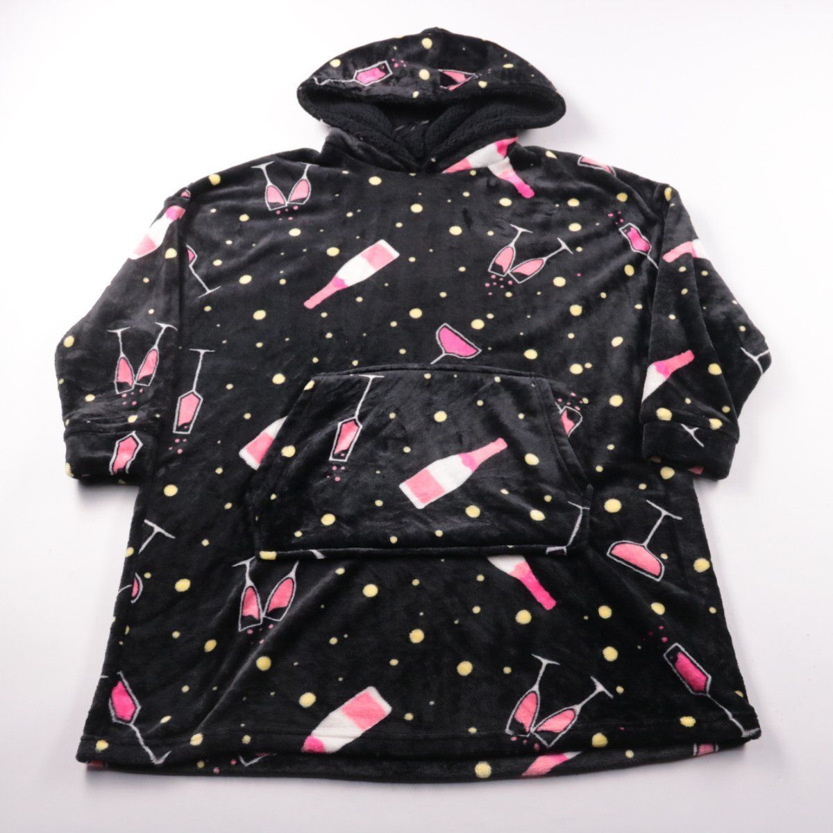 Худи George из мягкого плюшевого материала с капюшоном и карманом-кенгуру. Чёрная основа с принтом бутылок/бокалов и конфетти подойдёт для дома и уютных прогулок в прохладную погоду. Практичный плюс — полностью из полиэстера, легко стирается и быстро сохнет.