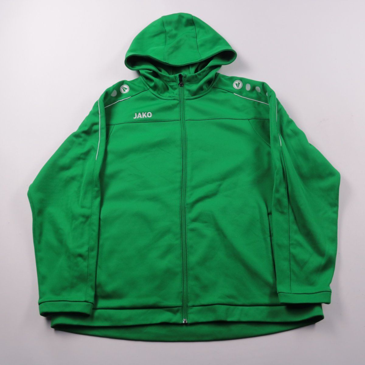 Спортивная толстовка Jako на молнии с капюшоном, выполнена в ярком зелёном цвете и с контрастными вставками на плечах. Подойдёт для тренировок, прогулок и повседневной носки в прохладную погоду. Практичный плюс — лёгкий полиэстер быстро сохнет и прост в уходе.