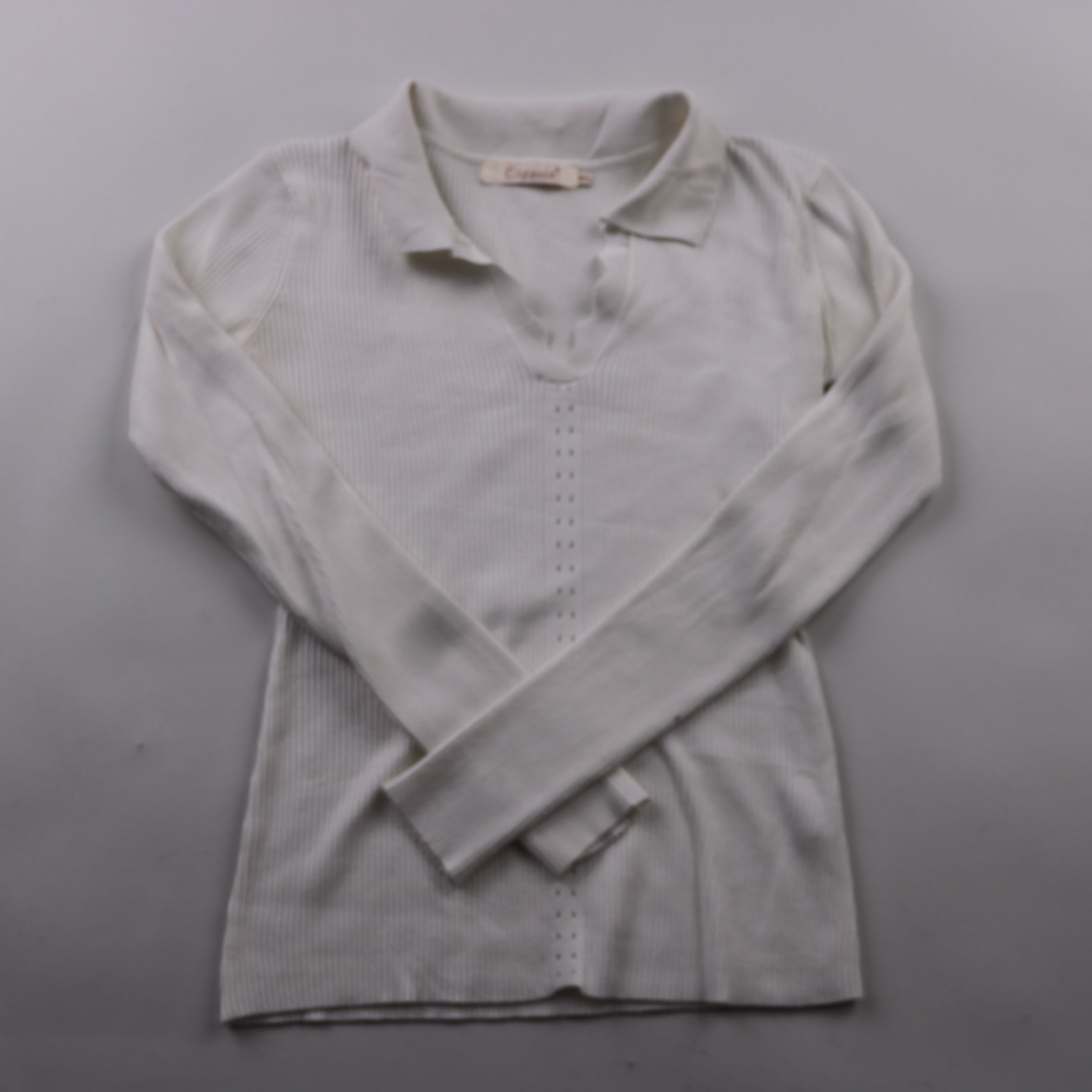 Лонгслив Capsule молочного цвета из тонкого ребристого трикотажа с воротником-поло и V-вырезом. Подойдёт для повседневных образов и в офис с жакетом или кардиганом. Материал мягкий и хорошо тянется, удобно сидит по фигуре.