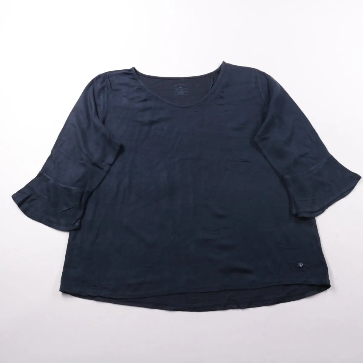 Женская футболка Tom Tailor тёмно-синего цвета с V-образным вырезом и рукавами с воланом. Подойдёт для повседневных образов в тёплое время года и для офиса с жакетом. Лёгкая ткань и свободный крой не стесняют движения.
