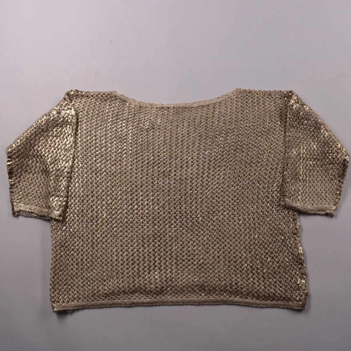 Женский укороченный топ Rinascimento из ажурного трикотажа с металлическим блеском. Подойдёт для летних образов и вечеринок, хорошо смотрится поверх бельевого топа/майки. Лёгкий и дышащий материал даёт комфорт и свободу движений.