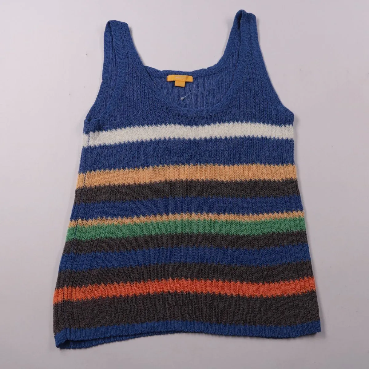 Вязаный топ Ginatricot в полоску с широкими бретелями и округлым вырезом. Подойдёт для лета и тёплой погоды, можно носить как самостоятельный верх или в многослойных образах. Трикотажная фактура хорошо тянется и комфортно садится по фигуре.