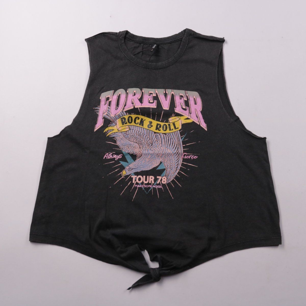 Женский хлопковый топ ONLY чёрного цвета с принтом «Forever Rock & Roll» и широкими проймами. Подойдёт для повседневных образов и концертов/фестивалей, хорошо сочетается с джинсами и шортами. Узел по низу позволяет легко регулировать посадку и длину.