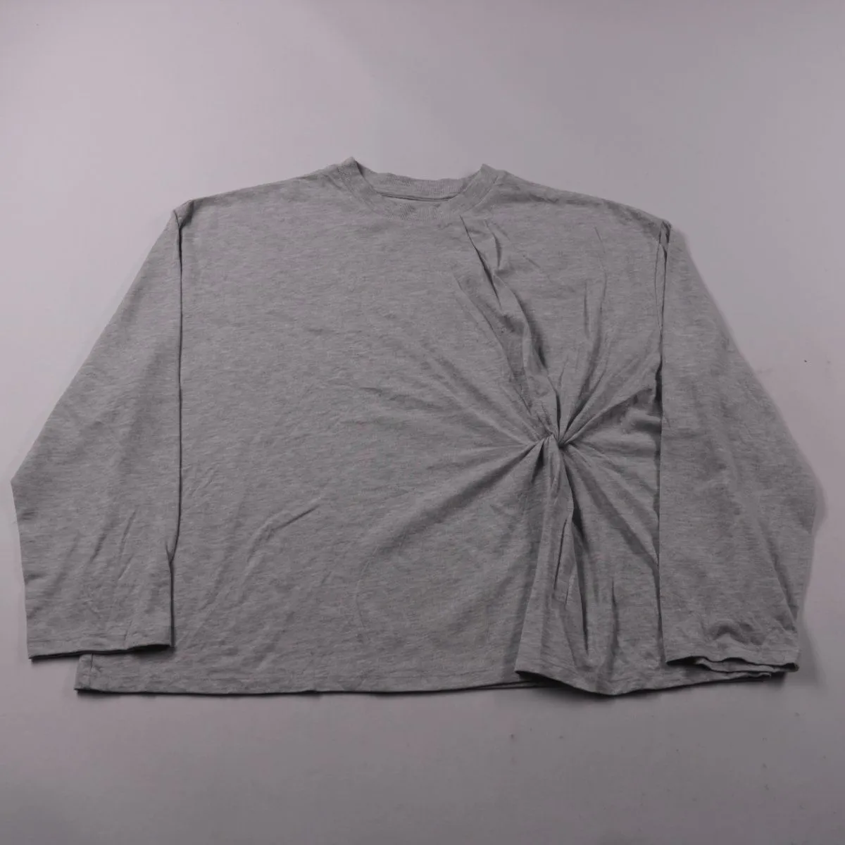 Серый лонгслив ASOS Edition из мягкого трикотажа с декоративной драпировкой/узлом сбоку. Подойдёт для повседневных образов в прохладную погоду и легко сочетается с джинсами или юбкой. Практичный плюс — ткань с хлопком в составе, комфортная к телу.