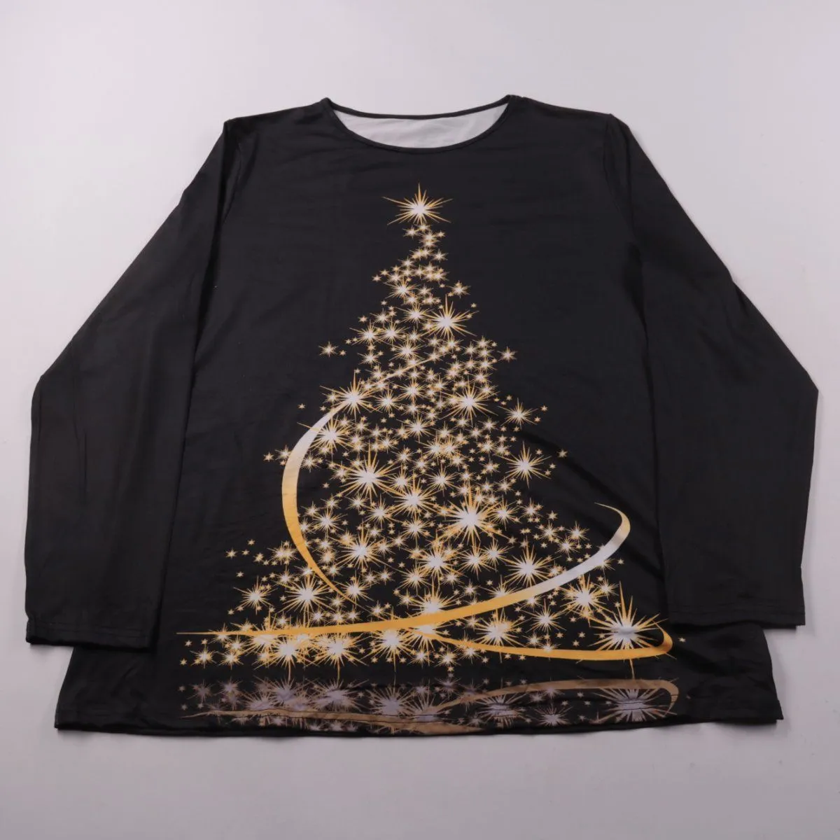 Женский чёрный лонгслив с праздничным принтом в виде сияющей ёлки. Подойдёт для повседневных образов и тематических мероприятий/праздников. Трикотаж тянется и не стесняет движений.
