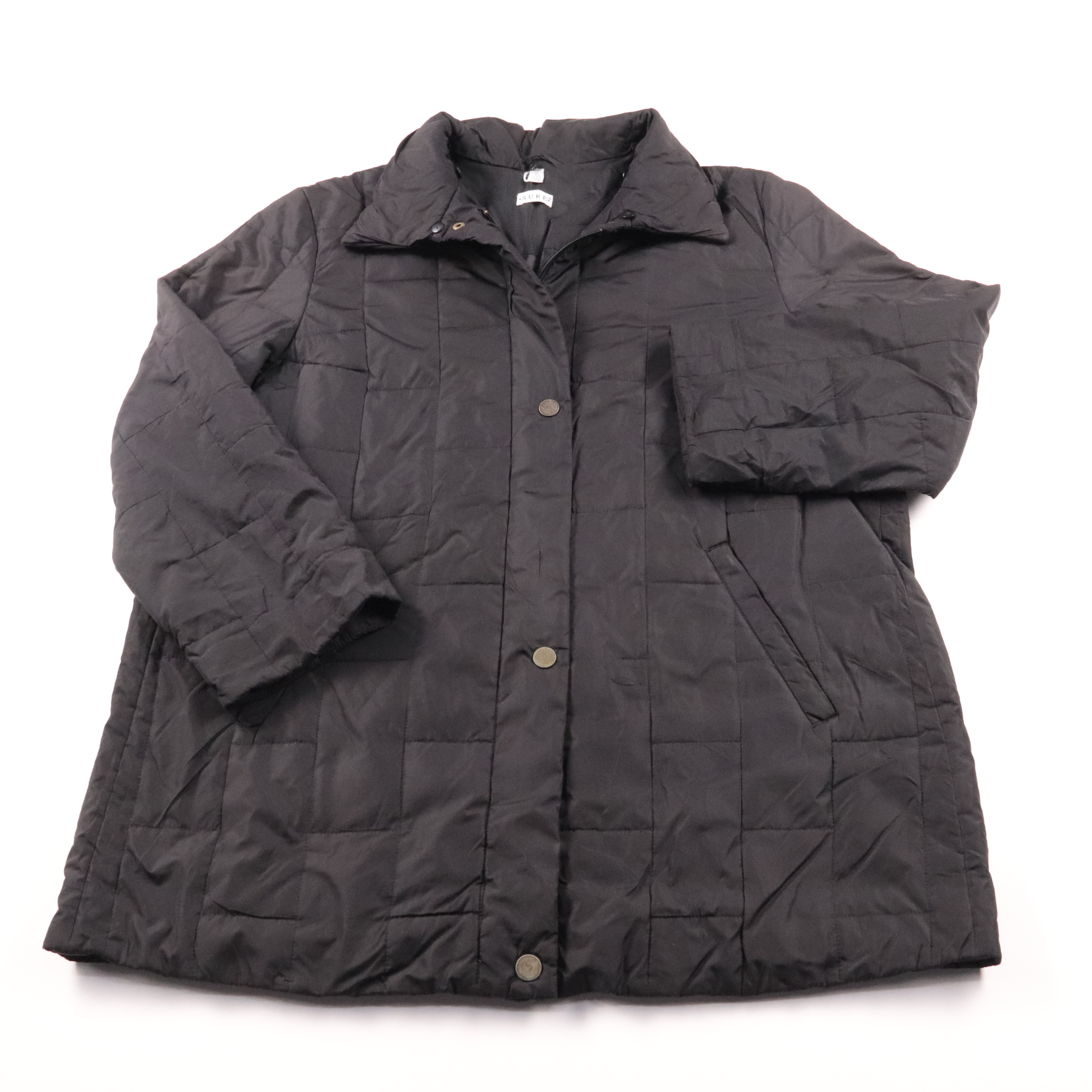 Стёганая демисезонная куртка Sure чёрного цвета с воротником-стойкой и застёжкой на кнопки, есть боковые карманы. Подойдёт на каждый день и для прогулок в прохладную погоду. Практичная: лёгкая и быстро сохнет.