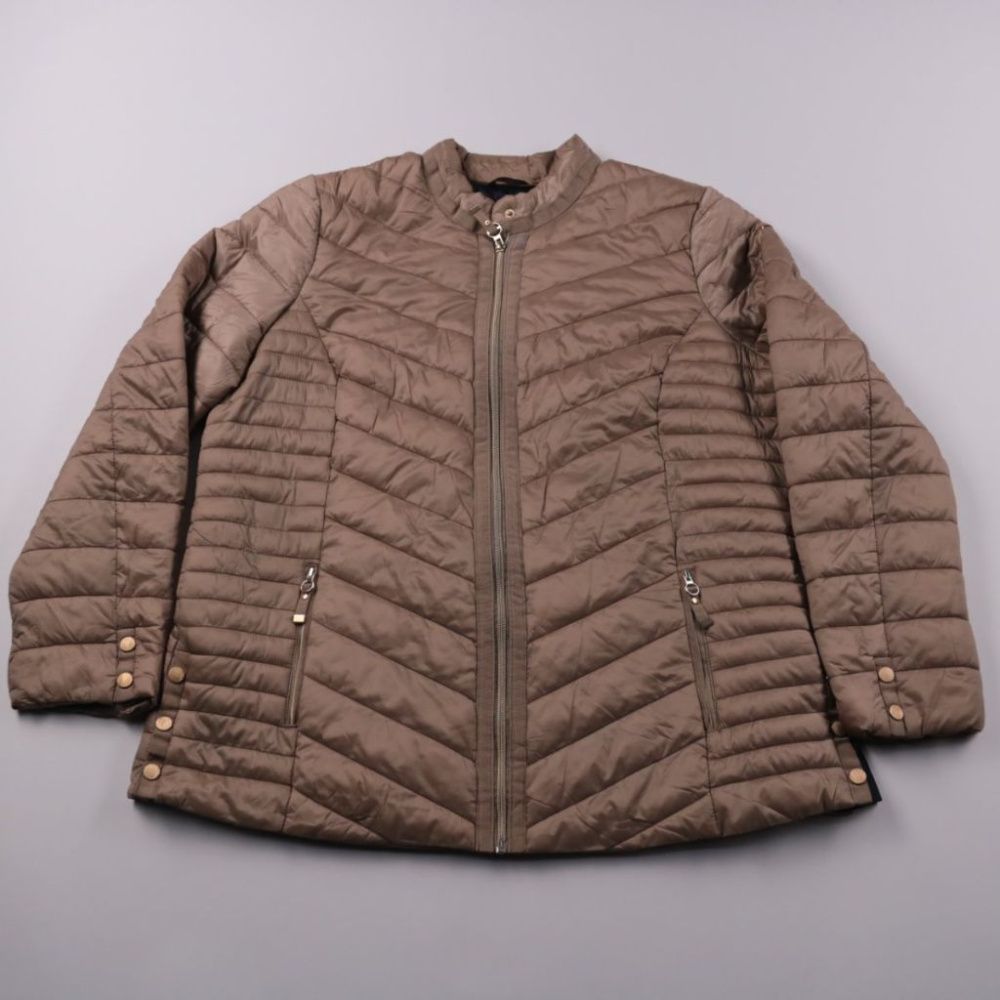 Стёганая демисезонная куртка Women essentials by Tchibo коричневого цвета, на молнии, с воротником-стойкой и карманами на молниях. Подойдёт для прохладной весны/осени и для повседневных прогулок, когда нужен лёгкий утепляющий слой. Практична тем, что б...