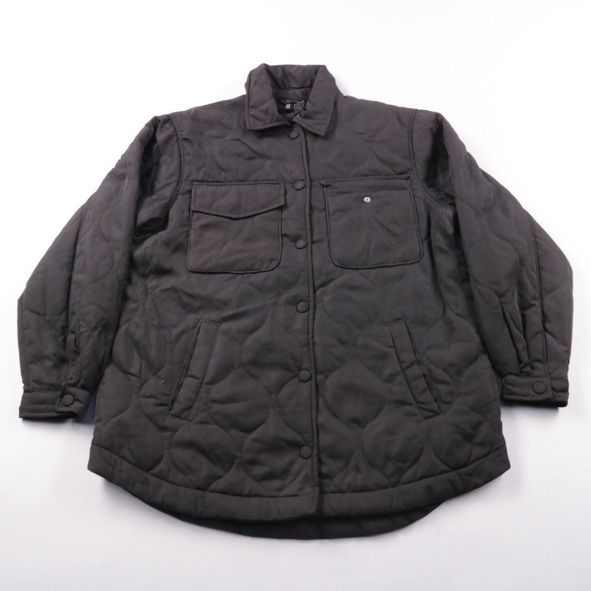 Стёганая демисезонная куртка H&M чёрного цвета на кнопках, с отложным воротником и накладными карманами спереди. Подойдёт для прохладной погоды и повседневных образов в городе. Практичный плюс — лёгкая и простая в уходе ткань из полиэстера.