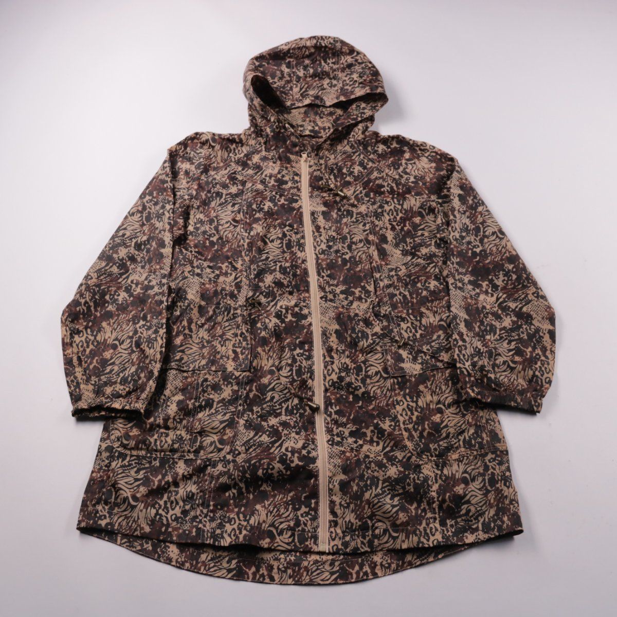 Женская лёгкая куртка с капюшоном на молнии, бренд не указан. Подойдёт для демисезона и прохладной погоды, удобна для повседневной носки благодаря удлинённому крою и карманам. Материал из 100% полиэстера практичен в уходе и быстро сохнет.