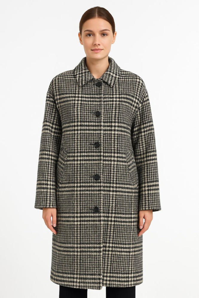 Женское пальто J-1st. в классическую клетку, прямого силуэта на пуговицах. Подойдёт для повседневных образов в прохладную погоду осенью и весной. Практичная ткань и спокойная расцветка легко сочетаются с базовой обувью и аксессуарами.