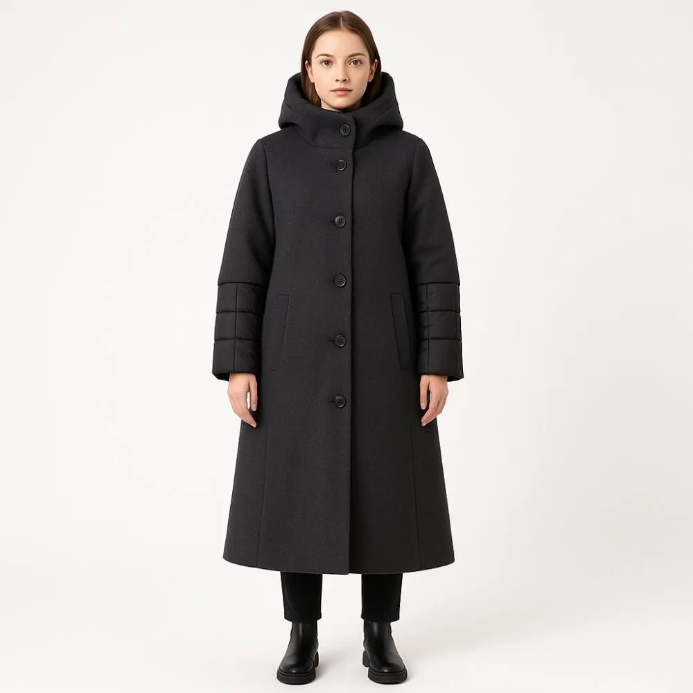 Женское зимнее пальто Esprit чёрного цвета с объёмным капюшоном и застёжкой на пуговицы. Подойдёт для повседневной носки в холодную погоду и поездок по городу. Длинный крой хорошо закрывает ноги от ветра, есть карманы.