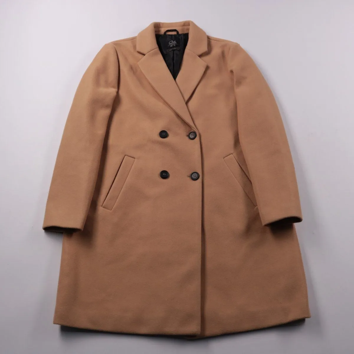 Женское двубортное пальто Clockhouse в бежевом (camel) цвете, с лацканами и накладными карманами. Подойдёт для повседневных и офисных образов в прохладную погоду весной и осенью, хорошо сочетается с джинсами и классическими брюками. Практичный плюс — немаркий оттенок и простая в уходе подкладка.