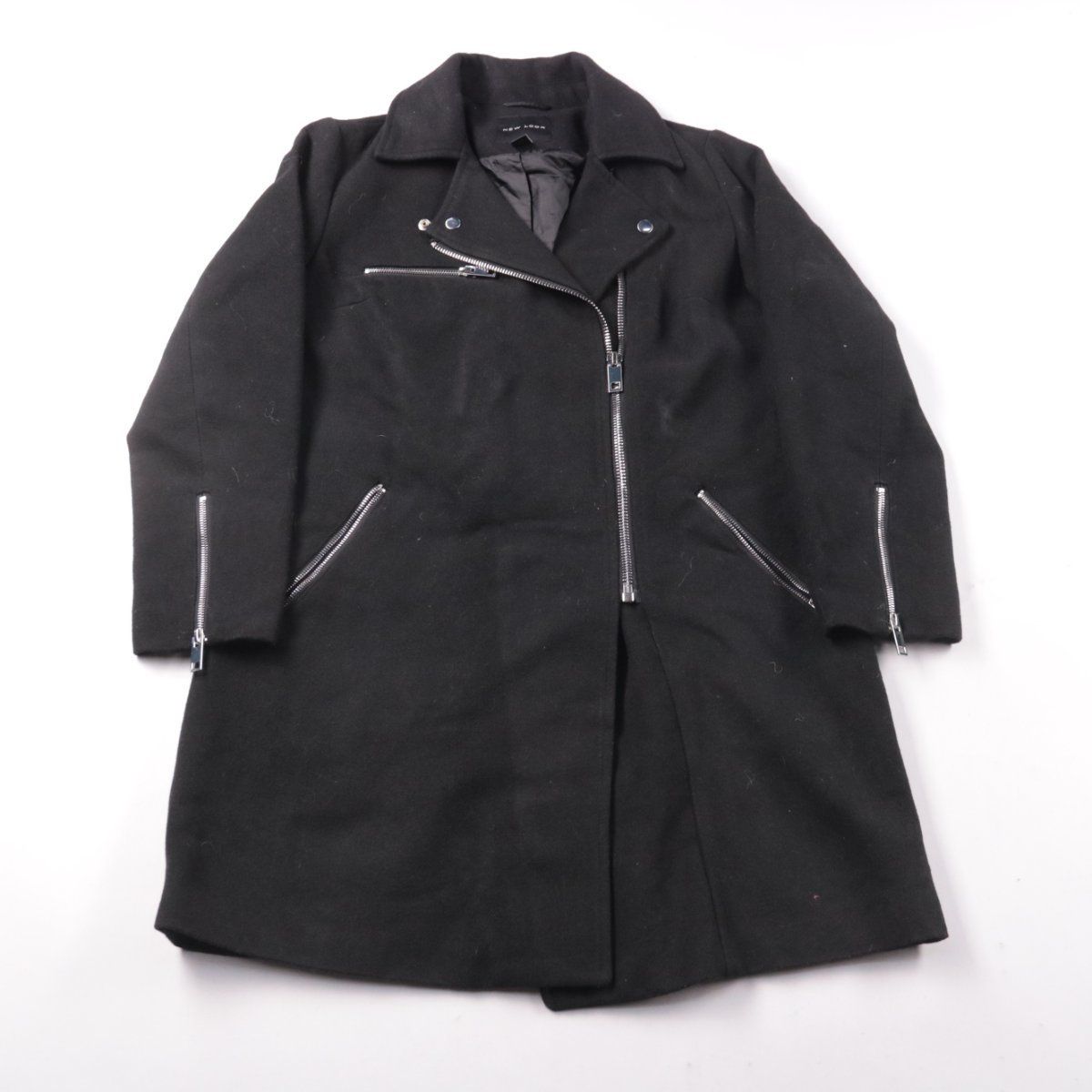 Женское пальто New Look чёрного цвета с асимметричной молнией и карманами на молнии. Подойдёт для повседневной носки в прохладную погоду и сочетания с ботинками или кроссовками. Практичное преимущество — застёжка на молнию хорошо защищает от ветра.