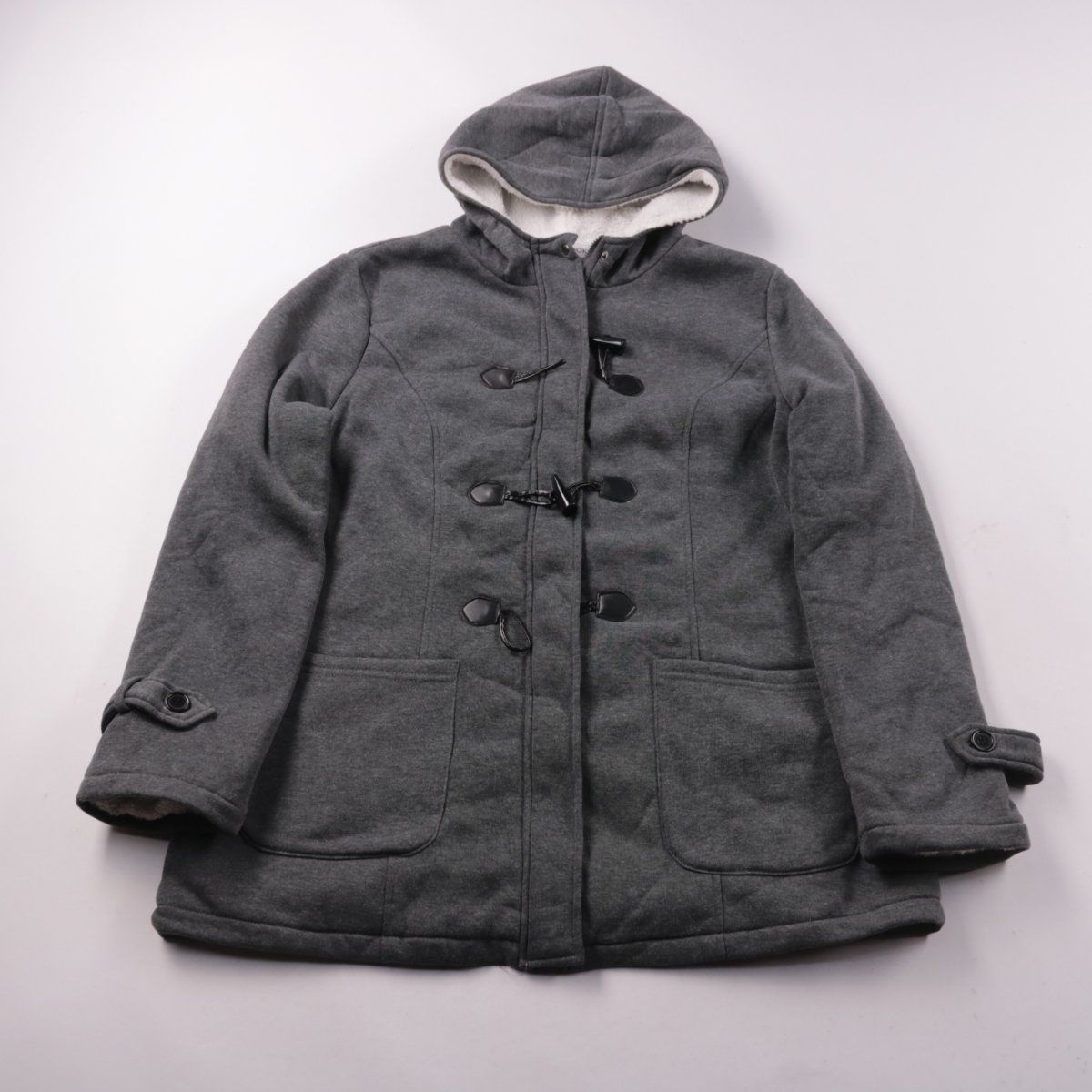 Женское пальто Misslook серого цвета с капюшоном и застёжками на клеванты. Подойдёт для холодной погоды и повседневных прогулок, внутри тёплая мягкая подкладка. Практичный плюс — вместительные накладные карманы.
