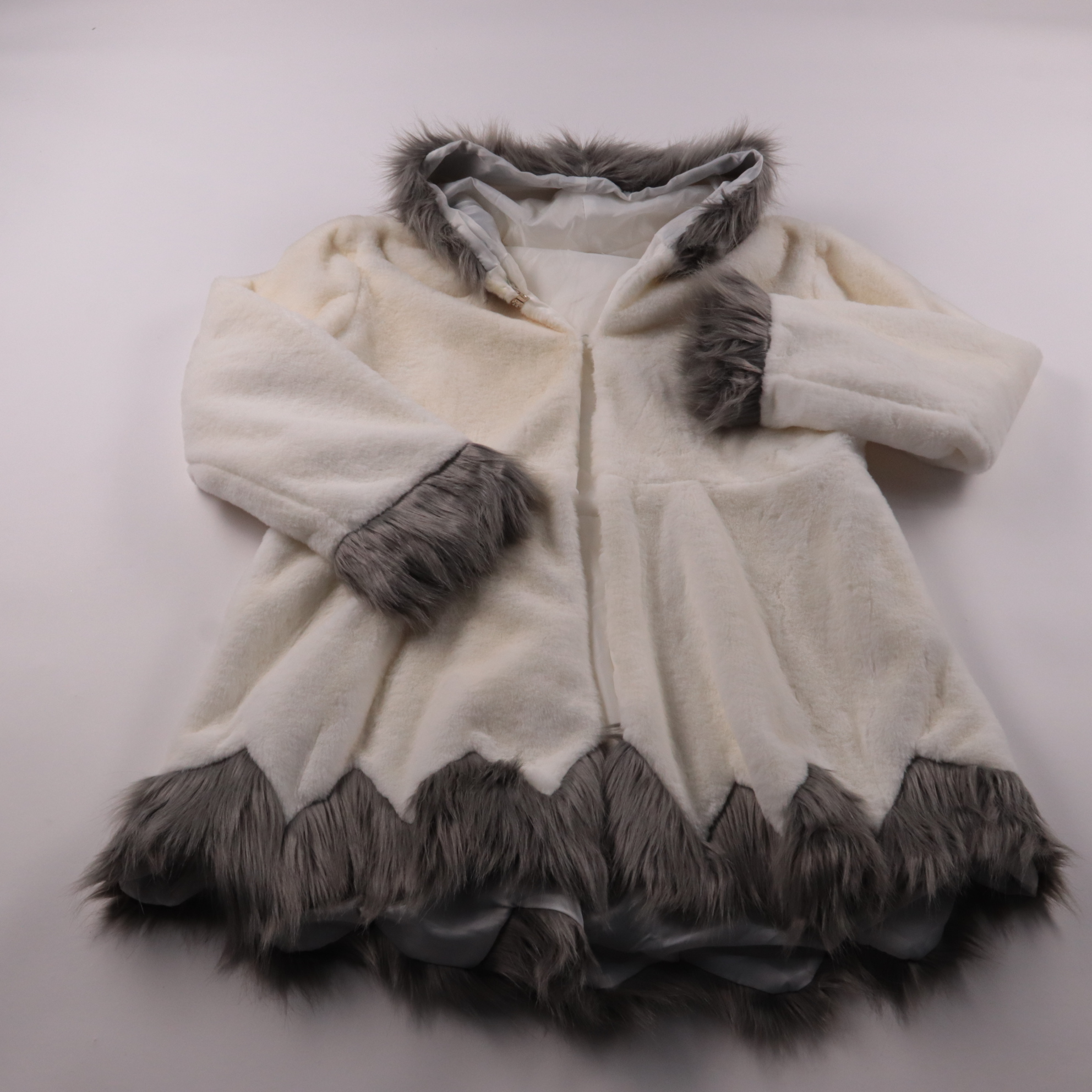 шуба Fashion белого цвета с серой меховой отделкой по капюшону, манжетам и низу. Подойдёт для зимних прогулок и поездок в холодную погоду. Мягкая подкладка добавляет комфорта и помогает сохранять тепло.