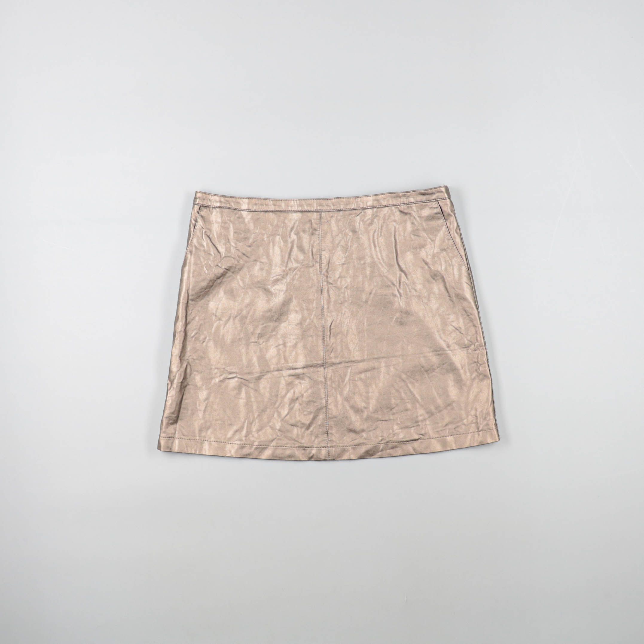 Юбка мини с лёгким блеском в бежевом оттенке, без явного бренда. Подойдёт для повседневных образов и выхода, хорошо сочетается с базовыми топами и жакетами. Практичный плюс — нейтральный цвет легко комбинировать с обувью и аксессуарами.