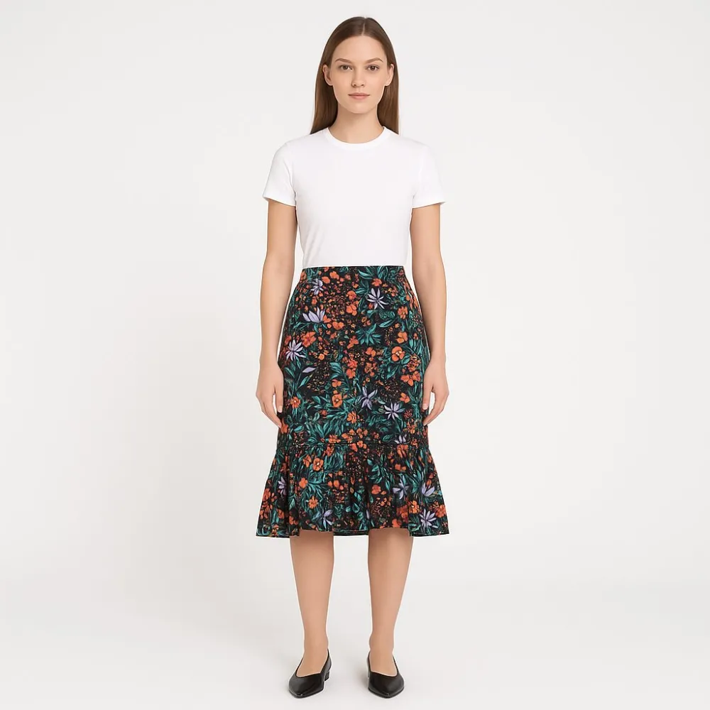 Юбка Bonmarché с цветочным принтом и расклешённым низом, выполнена из лёгкого полиэстера. Подойдёт для повседневных образов и для офиса с однотонным верхом. Материал почти не мнётся и быстро сохнет.