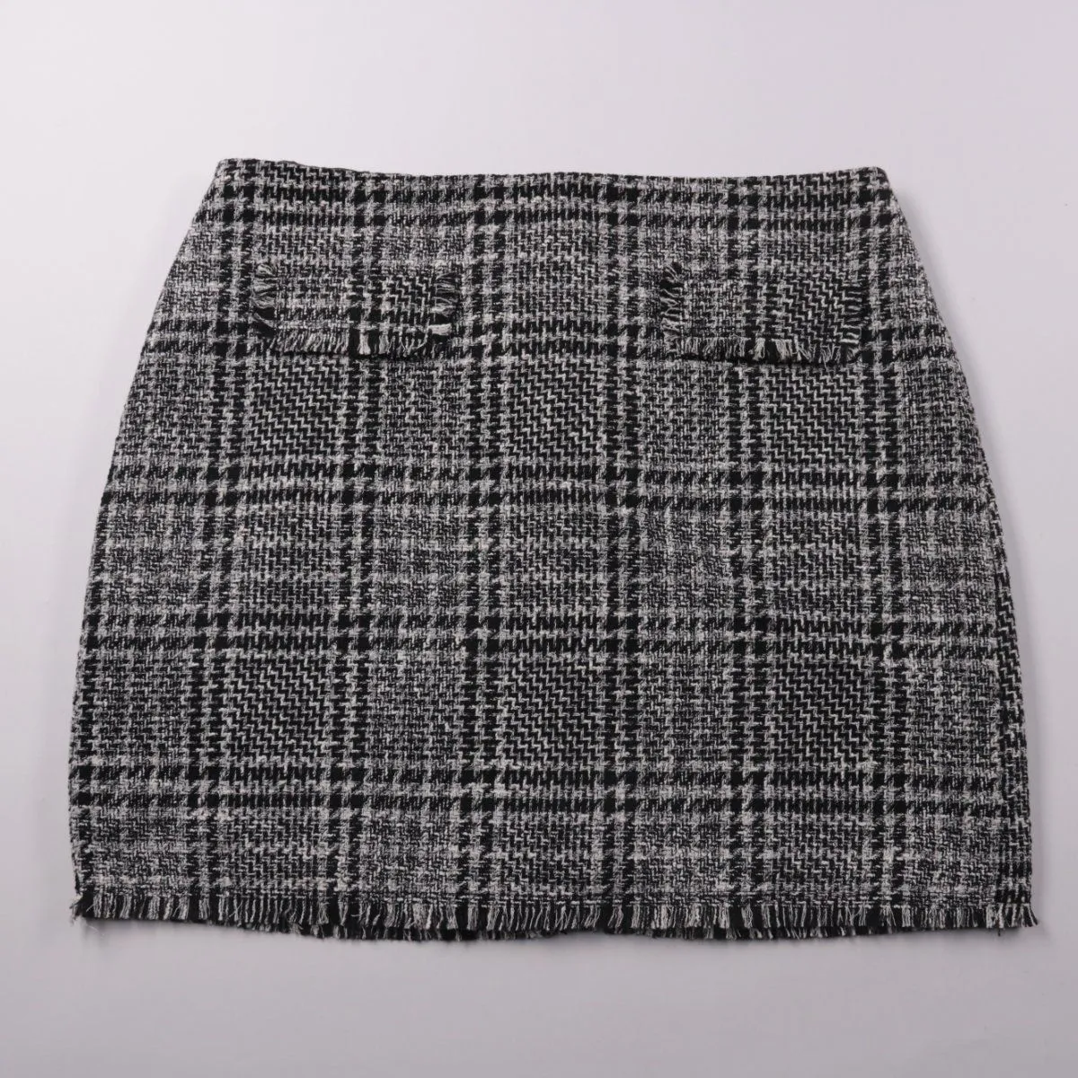 Юбка George из плотной ткани в серо-чёрную клетку, с небольшими декоративными «бахромой» по низу. Подойдёт для повседневных и офисных образов в прохладную погоду, хорошо сочетается с однотонными водолазками и жакетами. Есть подкладка, поэтому комфортно сидит и меньше электризуется.