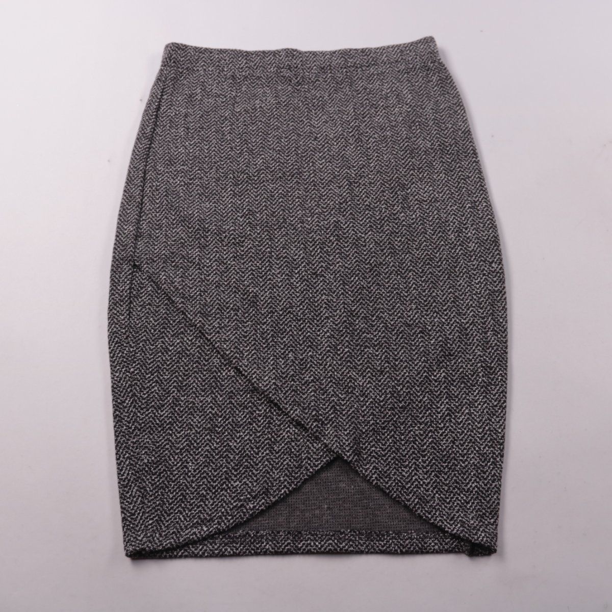Юбка AMISU серого цвета с узором «ёлочка», прямого кроя с эффектом запаха спереди. Подойдёт для офиса и повседневных образов в прохладную погоду. Плотная ткань хорошо держит форму.
